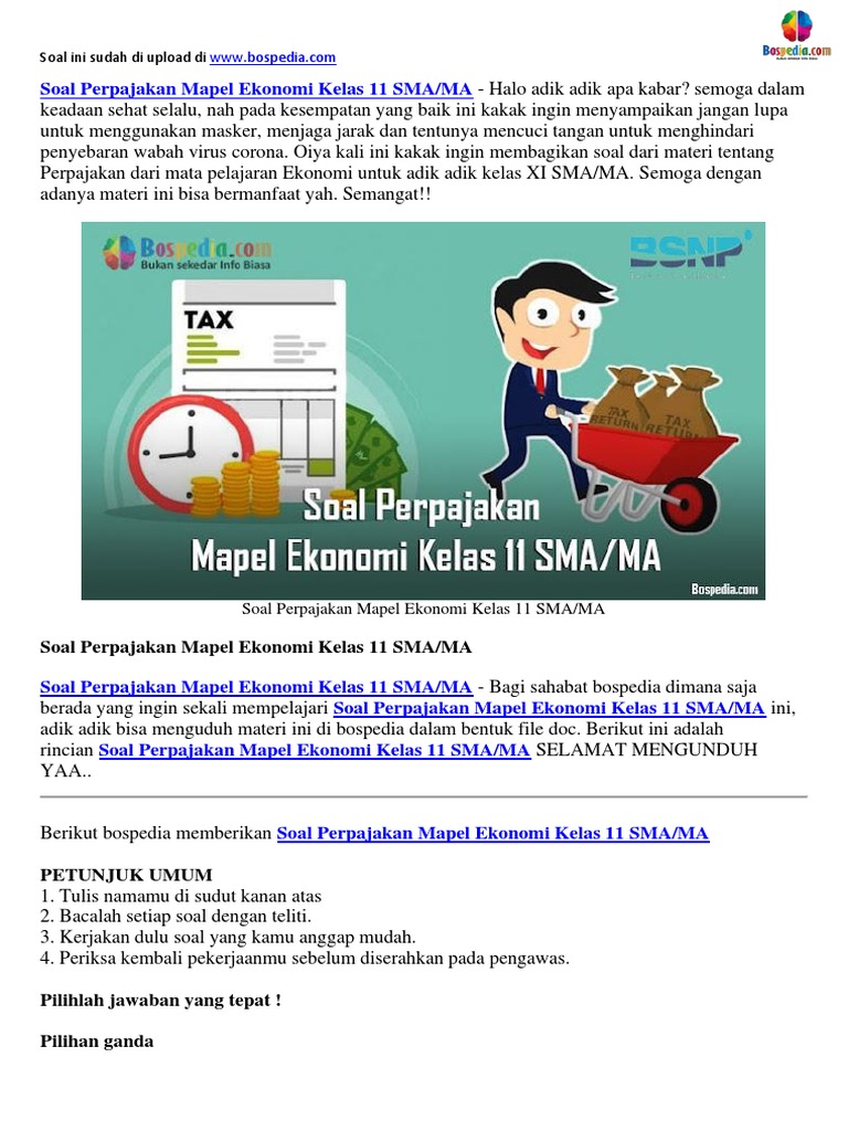 Pajak merupakan salah satu aspek fundamental dalam sistem perekonomian suatu negara. Memahami konsep perpajakan, mulai dari jenis-jenisnya hingga cara perhitungannya, sangat penting bagi setiap warga negara. Di jenjang Sekolah Menengah Atas (SMA), khususnya kelas 11 semester 2, materi perpajakan menjadi salah satu fokus pembelajaran. Artikel ini akan membahas secara mendalam berbagai contoh soal perpajakan yang sering muncul, disertai dengan penjelasan yang komprehensif untuk membantu siswa dalam memahami dan menguasai materi ini.