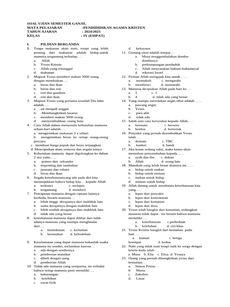Memasuki semester ganjil di jenjang kelas 4 Sekolah Dasar (SD) merupakan momen penting bagi para siswa. Salah satu evaluasi yang akan mereka hadapi adalah ujian mata pelajaran Agama. Ujian ini bukan sekadar serangkaian pertanyaan, melainkan sebuah kesempatan untuk mengukur pemahaman, meninjau kembali materi yang telah dipelajari, serta mempersiapkan diri untuk pemahaman keagamaan yang lebih mendalam di masa depan. Artikel ini akan membahas secara mendalam mengenai berbagai aspek yang umumnya tercakup dalam soal agama semester ganjil kelas 4, memberikan gambaran yang jelas bagi orang tua, guru, dan tentu saja, para siswa itu sendiri.